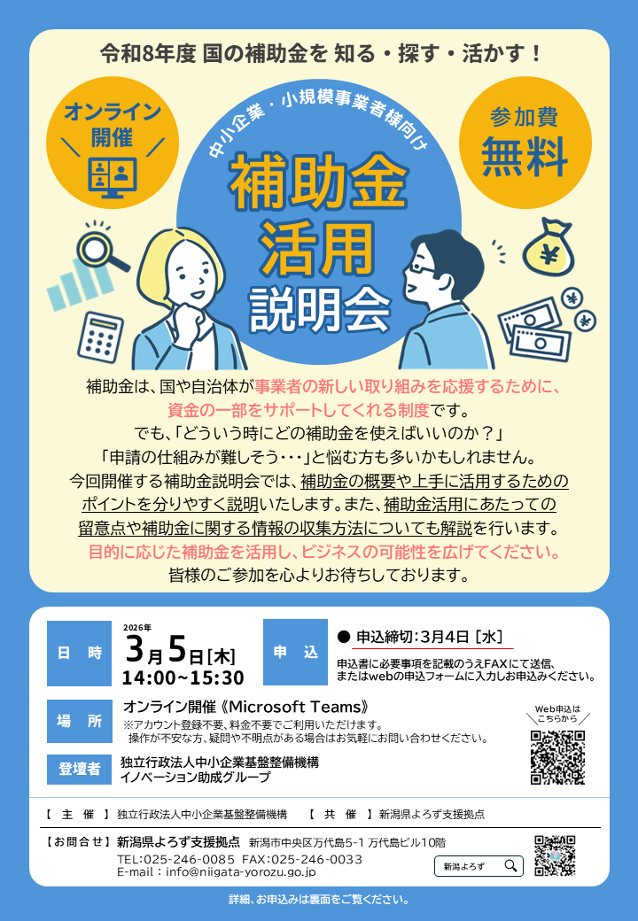中小企業・小規模事業者向けの補助金活用に関する説明会をオンラインにて開催いたします。